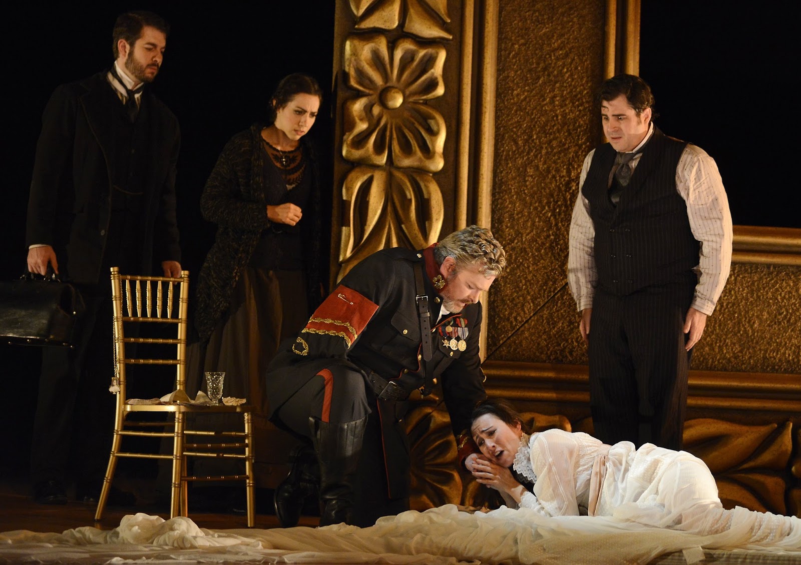 Germont, the father of Alfredo, gets a bad rap in the sad tale of the courtesan Violetta’s demise—he comes in with the best of intentions, determined to convince this fallen woman to leave his son alone, since their affair is ruining the family’s reputation and his daughter’s chance at marriage. Violetta impresses him, however, by agreeing to sacrifice her own happiness for Alfredo’s sake. After Germont hears of Violetta’s sickness, he and Alfredo rush back to her, but—è tardi! They are too late, and Violetta dies in Alfredo’s arms.